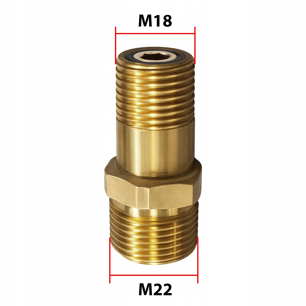 Adapter pozwala na dopasowanie lancy lub dyszy wymagającej gwintu M18 do instalacji wyposażonej w przyłącze M22. Solidne wykonanie z mosiądzu gwarantuje trwałość, odporność na korozję oraz długą żywotność przy pracy pod wysokim ciśnieniem.