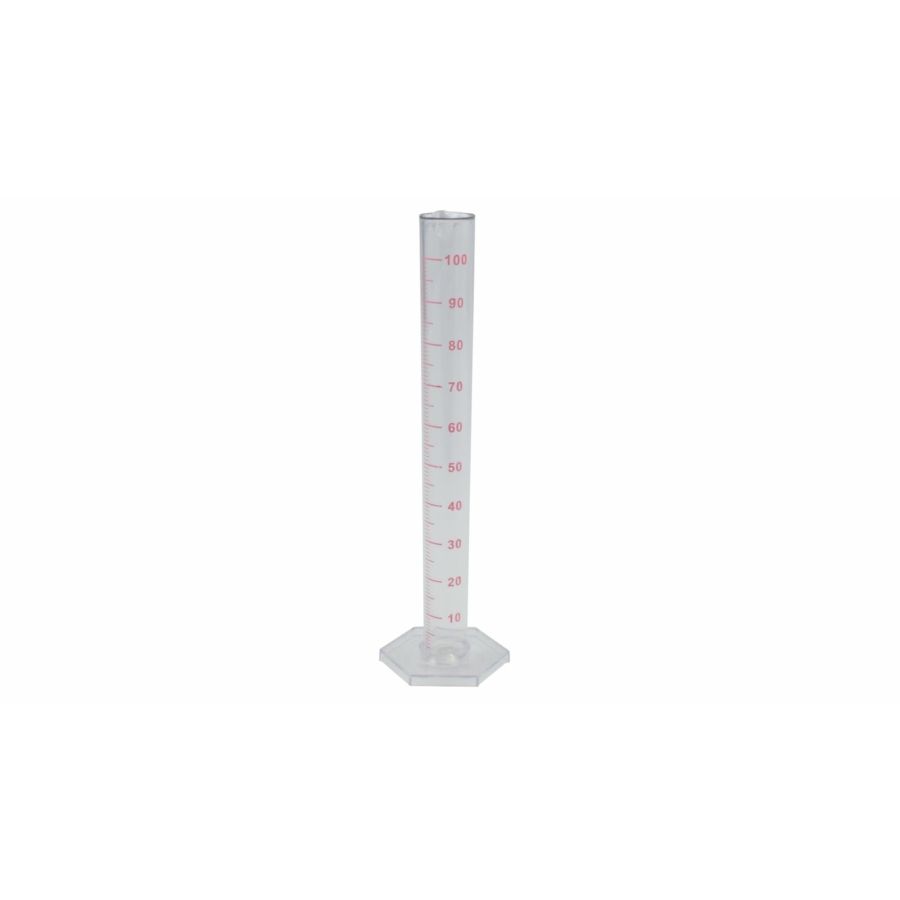 Celoplastični merilni valj. Orodje za merjenje vsebnosti alkohola in sladkorja v tekočini. Skupna višina 26,5 cm, premer dna 8 cm. Izmerjena prostornina od 10 do 100 ml. Ilustrativna slika izdelka. EAN 5999558577056