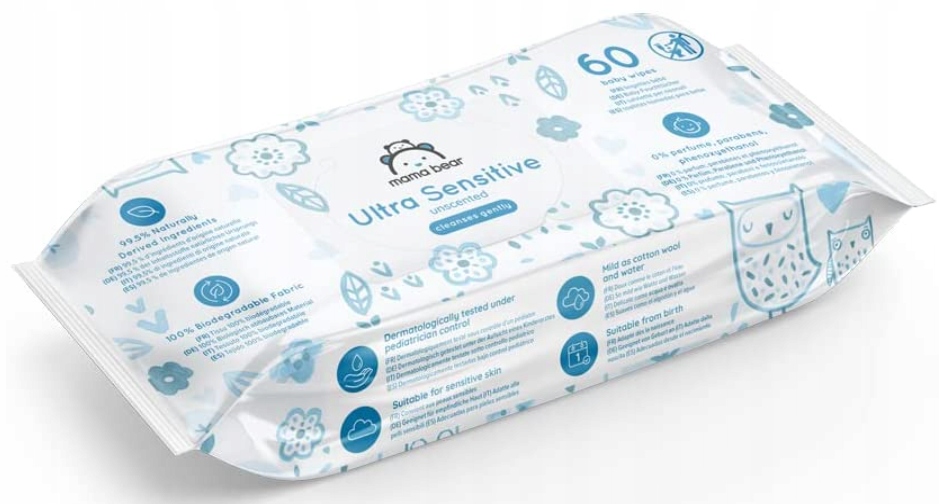 Mama Bear Ultra Sensitive Baby Wipes so bili posebej zasnovani za nežno čiščenje občutljive kože in novorojenčkov. So nežni kot bombaž in voda, zaradi česar so primerni za vsako situacijo, še posebej pri menjavi plenic.