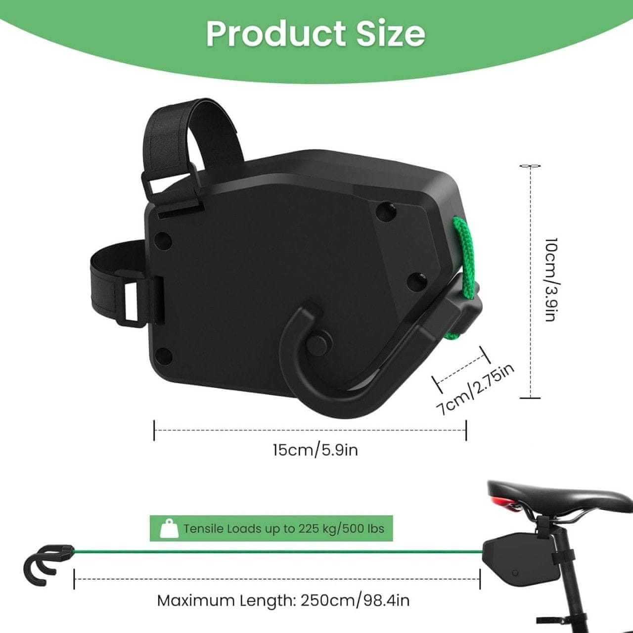 • Enostavno nameščanje z dvojnimi kovinskimi kavlji in varnostno karabinko omogoča hitro in varno pritrditev na katerokoli kolo.