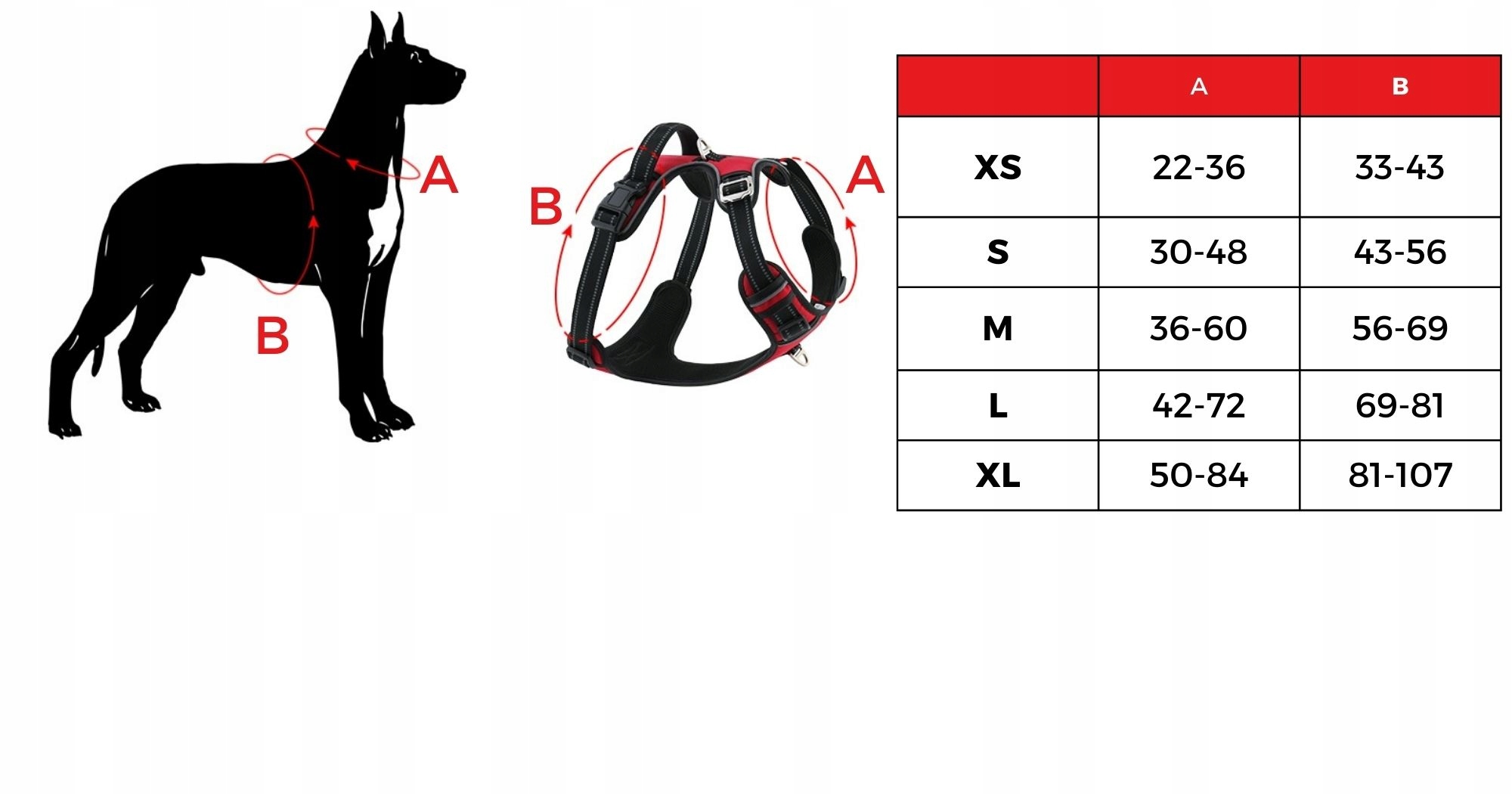 - Velikost XL: Popolno za večje pasme, kot so zlati prinašalec, doberman, rotvajler, labradorec, nemški ovčar ali boksar. Dimenzije so obseg prsnega koša 81–107 cm in obseg vratu 50–84 cm. Priporočljivo za pse, težke do 40 kg.