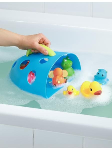 Plastična škatla za kopalne igrače z ročajem in priseskom za pritrditev. Celoten opis