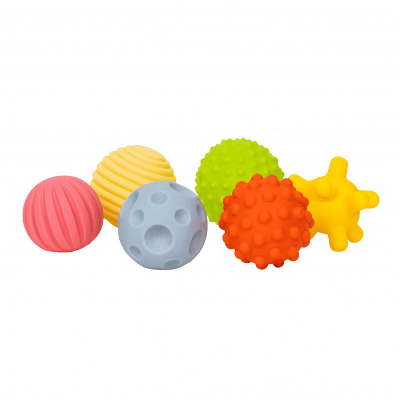 Komplet 6 mehkih žogic različnih barv za spodbujanje otrokovih čutil. Vsaka žogica ima drugačno teksturo, kar spodbuja otrokovo domišljijo in zagotavlja nove čutne vtise. Čutne žogice so odlične tudi za otroško masažo, ki sprošča napetost malčkovih mišic. Žogice so namenjene tudi zabavi ob kopanju. Celoten opis