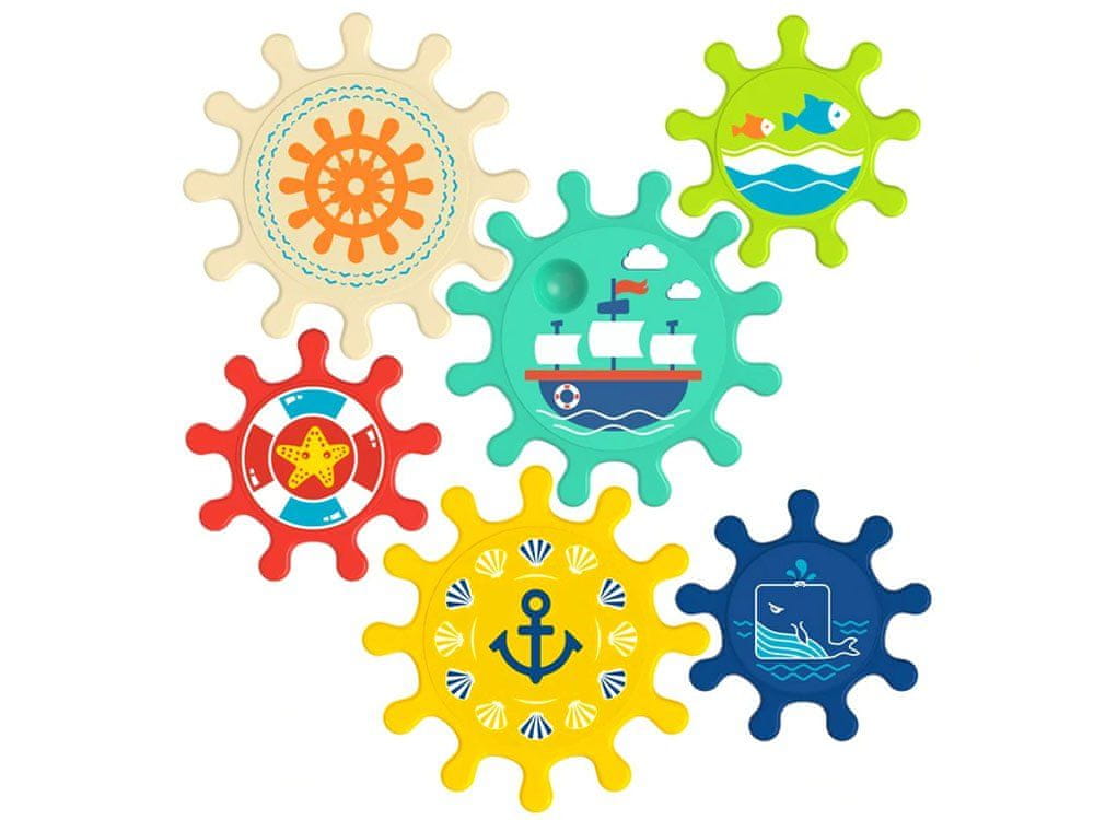 Barvni zobniki, ki se pritrdijo na ravno površino, se uporabljajo za zabavo, saj jih lahko na primer spravite v gibanje z vodo ali rokami. Komplet šestih pisanih zobnikovów z mornarsko grafiko in barvami se bo podal v vsako kopalnico, v kateri se kopa vaš otrok.