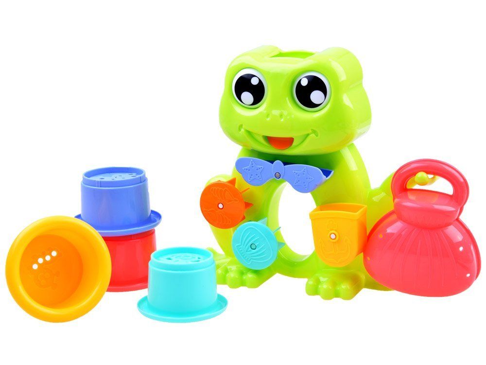 Prelivanje vode čez glavo žabice sproži veselo kaskado vode čez kolute, ki so na žabici. Voda se preliva od vrha do dna in veselo vrti kolute okoli lastne osi. Otrok lahko s pisanimi skodelicami preliva vodo, oblikuje piramido ali jih pusti plavati po vodi; poleg tega bo sam našel način, kako uporabiti to igračo. Igrača je v celoti izdelana iz plastike v zelo privlačnih barvah in bo popestrila vsakodnevno večerno kopel vsakega otroka.