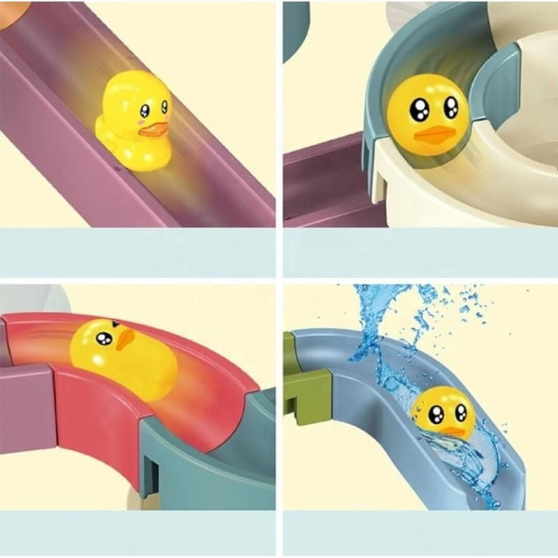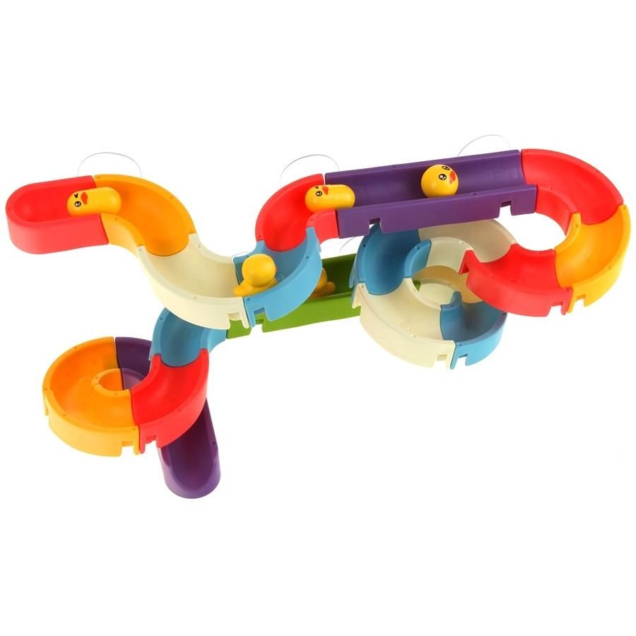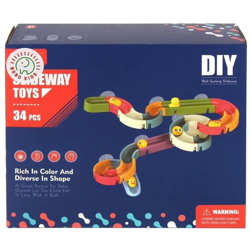 Kopalna steza v obliki tobogana za račke bo idealna kopalna igrača za vsakega otroka. Postavite progo in poglejte, katera raca bo hitrejša in bo lahko bolje dokončala progo. Izmislite si različne kombinacije in ustvarite svoj poligon z ovirami, vsakič je lahko drugačen. Edina omejitev je vaša domišljija. Preverite, ali so račke kos vsaki oviri. Čudovita igrača, ki ne spodbuja le kopanja, ampak tudi podpira pravilen razvoj otroka. V kompletu so priseski, s pomočjo katerih igračo enostavno pritrdite na steklo tuš kabine, kopalne kadi ali ploščice.