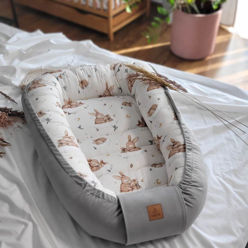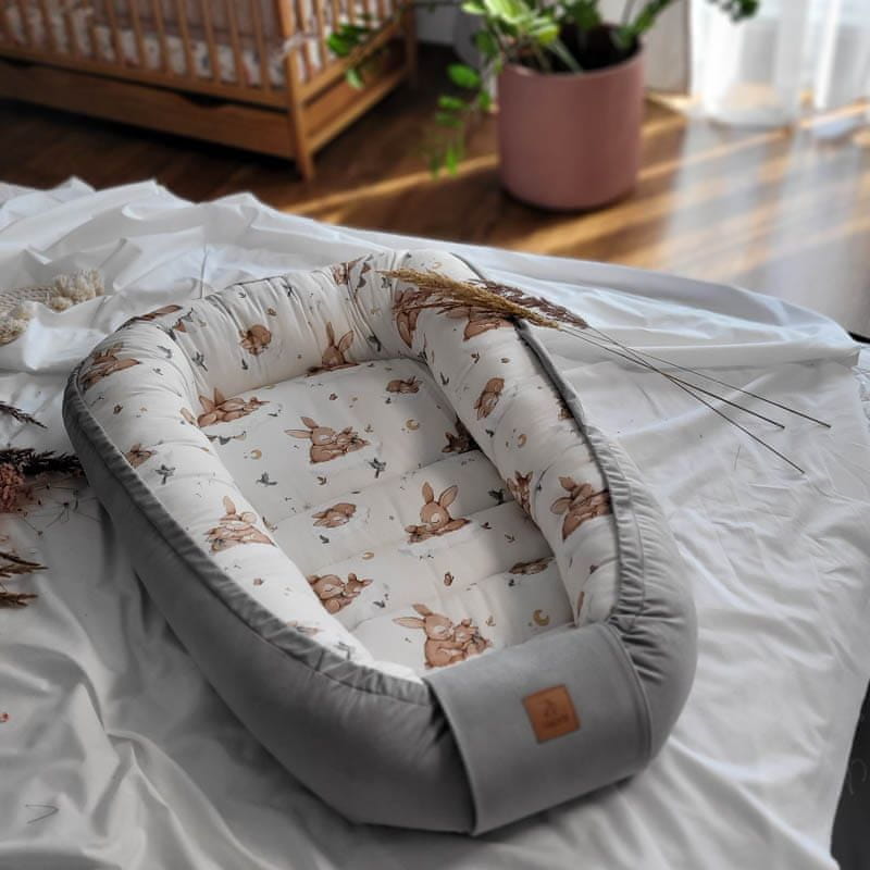 Dvostranski otroški kokon je edinstven izdelek, ustvarjen za najmlajše otroke – da imajo otroci vedno svoj namenski, prijazen prostor za igro, spanje in počitek pod budnim očesom staršev. Izdelan je iz certificirane 100 % bambusove viskoze in neverjetno mehkega žameta.
