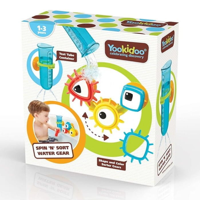 Inovativen sortirnik oblik z gibljivimi zobniki, ki ga imajo otroci radi v obliki poučne kopalne igrače, namenjene otrokom od 1. leta starosti. Zahvaljujoč njej se malček uči prepoznavanja oblik in barv, krepi motorične sposobnosti in eksperimentalno spoznava zakone fizike. Vodna igrača Yookidoo je bila ustvarjena po metodi STEM (okrajšava angleških besednih zvez – science, technology, engineering, mathematics). Med igro otrok širi svoje znanje o svetu okoli sebe in združuje užitek s koristjo. Set vsebuje: sortirnik oblik, pritrjen na kopalno kad s priseski, 3 oblike, epruveto, držalo s priseski. Kako se zabavati? v redu Pri 12 mesecih bo vaš dojenček pridobil večji nadzor nad svojimi rokami – to je odličen čas za pomoč pri razvoju motoričnih sposobnosti vašega malčka. Veliki, lahko prijemljivi geometrijski zobniki vodne igrače Yookidoo so odličen način, da svojega dojenčka uvedete v svet barv in oblik. Starši lahko otroka podpirajo tako, da poimenujejo posamezne oblike in barve, pokažejo delovanje zobnikov in spodbujajo samostojno igro. Glavne prednosti: poučna vodna igrača za otroke od 1. leta starosti, gibljivi elementi pritegnejo pozornost, vzbujajo radovednost o svetu, poučujejo o osnovnih principih gradnje, izobraževalni sorter vsebuje 3 nadvložke, ki jih je možno med seboj uskladiti po obliki in/ali barvi, geometrijski nadvložki sorterja so prilagojeni obliki majhnih rok, enostavno, higienično shranjevanje – igrača je na kad pritrjena s priseskom. Razvojne koristi za otroka: večsmerni razvoj otroka (malček eksperimentira, konstruira, pridobiva znanja o svetu okoli sebe), učenje vzročno-posledičnega mišljenja, podpiranje otrokove ročne koordinacije, sodelovanje oko-roka, senzorični razvoj otroka. Mere paketa: širina 18 cm, višina 19 cm, globina 7,5 cm. Starostna kategorija: 12m+ Sestava materiala: plastika