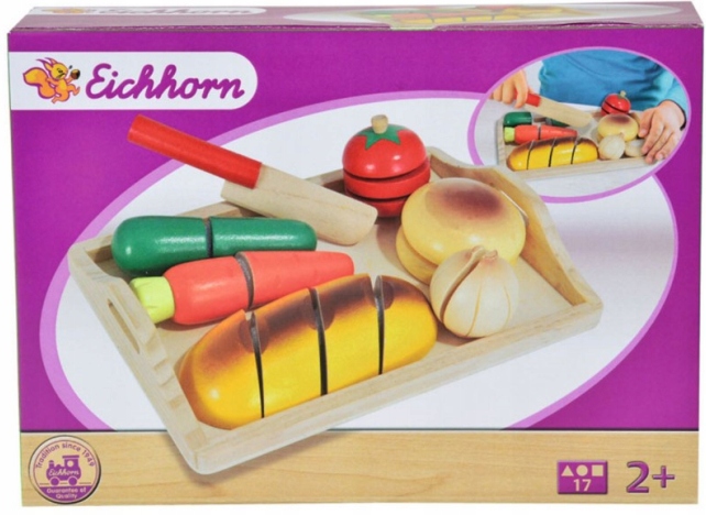 Enostavna igra – leseni prehrambeni izdelki so sestavljeni iz dveh do štirih lesenih delov, povezanih z ježkom. Otroci lahko z nožem režejo zelenjavo in kruh vzdolž zareze in tako izdelke razdelijo na rezine.