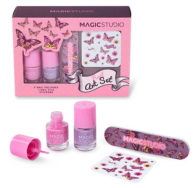 KOMPLET ZA PIN UP POKRAJŠANJE NOHTOV MAGIC STUDIO je zbirka izjemnih orodij za ustvarjanje dih jemajočih okraskov za nohte. Vsebuje 2 laka za nohte s prostornino 4 ml: roza in vijolična , pilica za nohte in nalepke s čudovitimi potiski rož in metuljev.