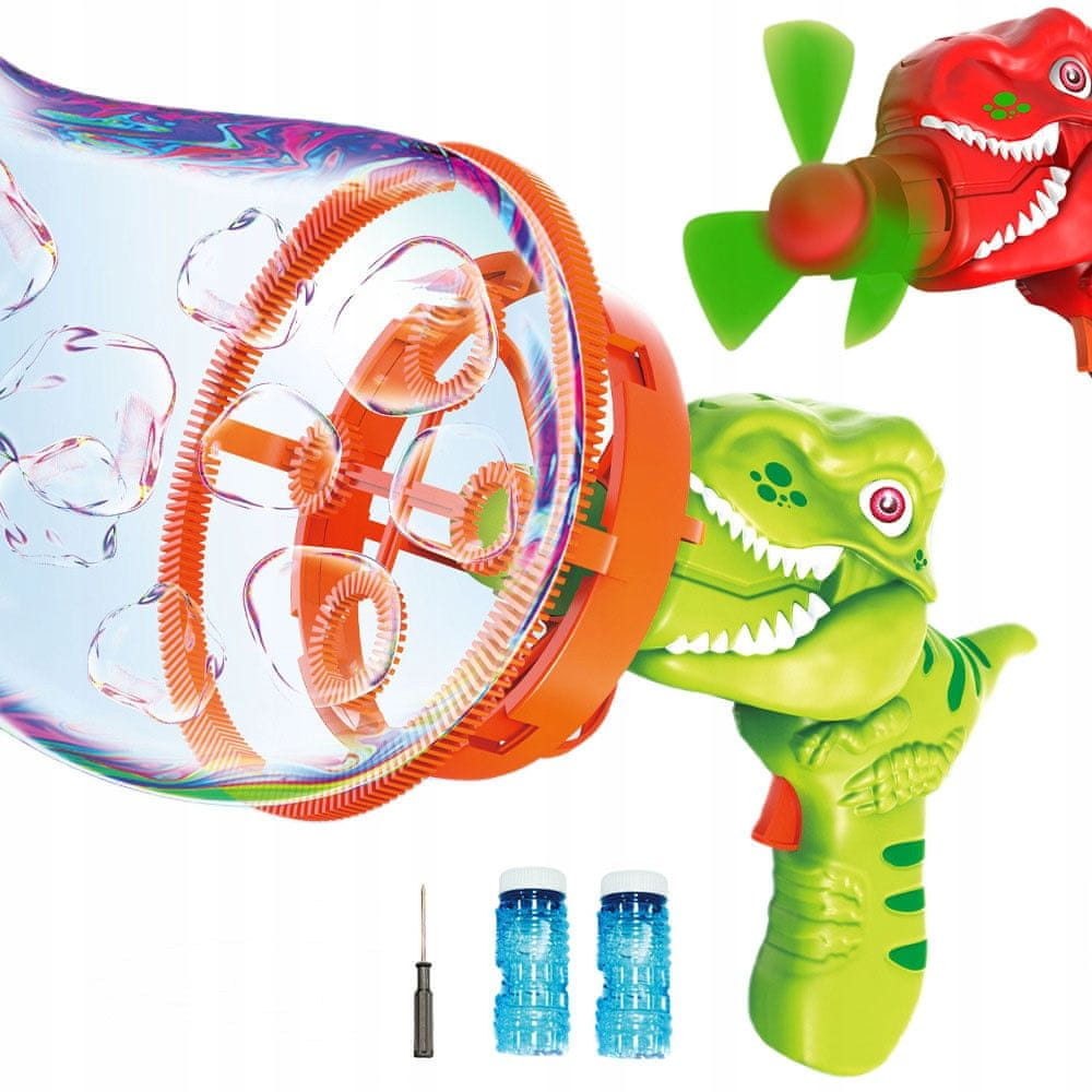 Fantastična zabava na dva načina! Ta edinstvena pištola za mehurčke v obliki dinozavra je odlična atrakcija za otroke, ki združuje funkcijo vetrnice z ustvarjanjem pisanih milnih mehurčkov.
