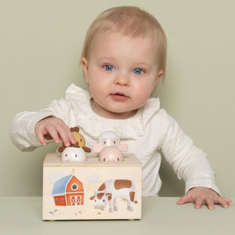 Tukevassa puulaatikossa on 4 eläintä Little Farm -kokoelmasta. Hellävaraisella painalluksella yksi eläin hyppää sisään ja toinen ponnahtaa ulos.