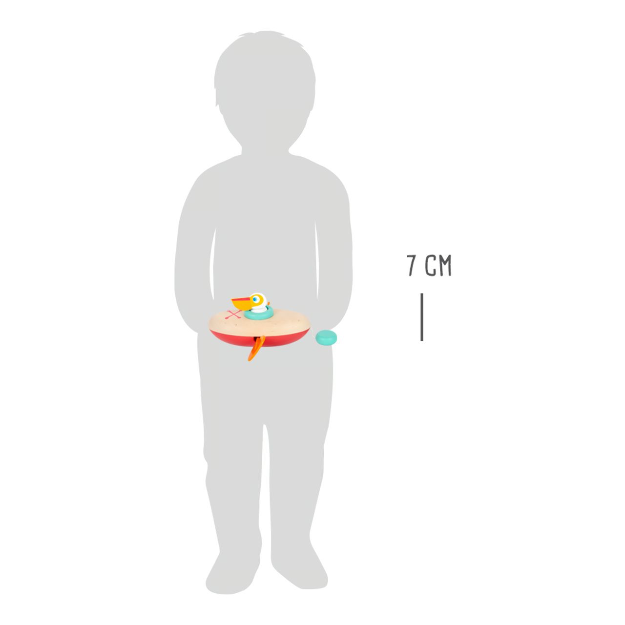Mali pelikan je dobil zeleno luč za križarjenje. Njegov kanu je narejen iz lesa in plastike in lahko sam plava po vodi – ima mehanizem za navijanje. Otroci se bodo s to igračo v vodi zelo zabavali. Igrače za vodo iz lesa so bolj zelena alternativa plastičnim in gumijastim igračam. Med igro s pelikanom bodo otroci zaradi mehanizma za navijanje spoznali načelo vzroka in posledice. Za daljšo življenjsko dobo igrače jo temeljito posušite, ko jo vzamete iz vode.Glavneznačilnosti: za uporabo v kopeli ali na bazenuzaviralni mehanizem omogoča vrtenje stranskih lopaticprimerno za razvoj domišljije in koordinacije