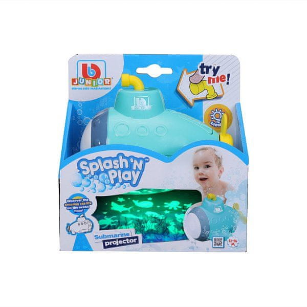 Podmornica s projektorjem Splash'N Play Junior je zagotovilo za veliko zabave za majhne otroke med plavanjem. Projektorska podmornica ob pritisku na periskop na dnu kadi ali bazena prikazuje edinstvene morske motive in otrokom omogoča podvodno pustolovščino. Barve projekcije se spreminjajo in premikajo z gibanjem vode. Otroci lahko premikajo projektor in tako ustvarjajo različne vzorce in slike, kar prispeva k interaktivni in zanimivi izkušnji. Podmornica je primerna za otroke od 12. meseca dalje. Deluje na 3 baterije AG13/LR44, ki so priložene. Velikost čolna je 5,5" (14 cm). Velikost paketa: 16 × 16,55 × 12,1 cm.