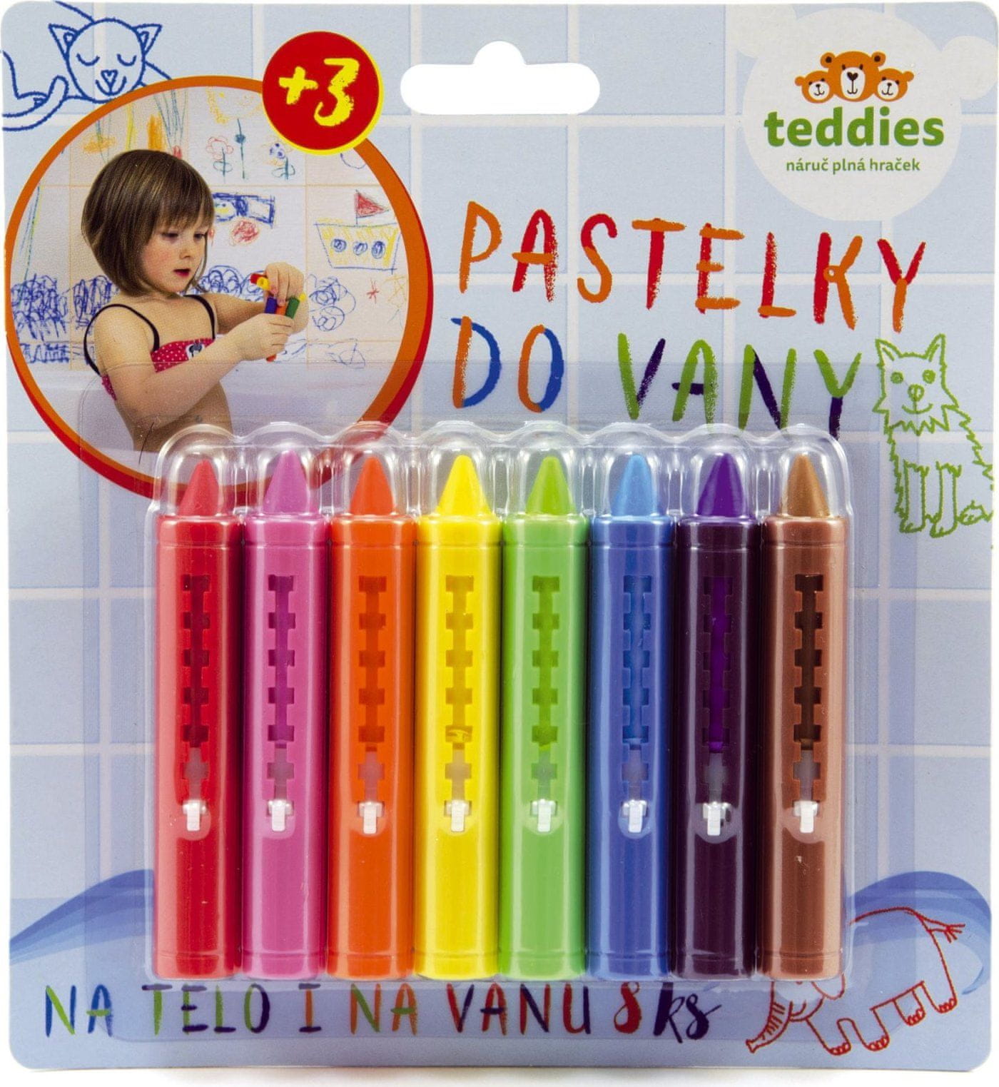 S kopalnimi barvicami se bo vaša kopalnica vsak dan spremenila v drugačen svet. Z njimi lahko rišete po kopalnici in ploščicah, otroci pa se bodo z njimi neizmerno zabavali. Ustvarijo lahko zaključene umetnine, mamicam pa ni treba skrbeti, saj je te barvice mogoče enostavno oprati. So popolnoma varni, nestrupeni in hipoalergeni. Komplet vsebuje 8 barvic