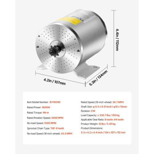 VEVOR Komplet brezkrtačnega električnega DC motorja 1800W 48V 4500rpm 134x107x112 mm