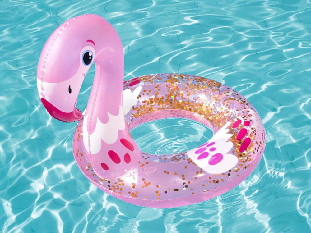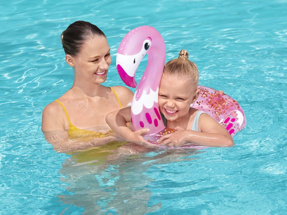 Očarljiv, eleganten plavalni obroč Shimmer N' Float™ je ponudba Bestway za počitniško lenarjenje v vodi. Krog v obliki rožnatega flaminga je napolnjen z bleščicami, ki lesketajoče in bleščeče v poletnem soncu pritegnejo pozornost vseh počitnikarjev.