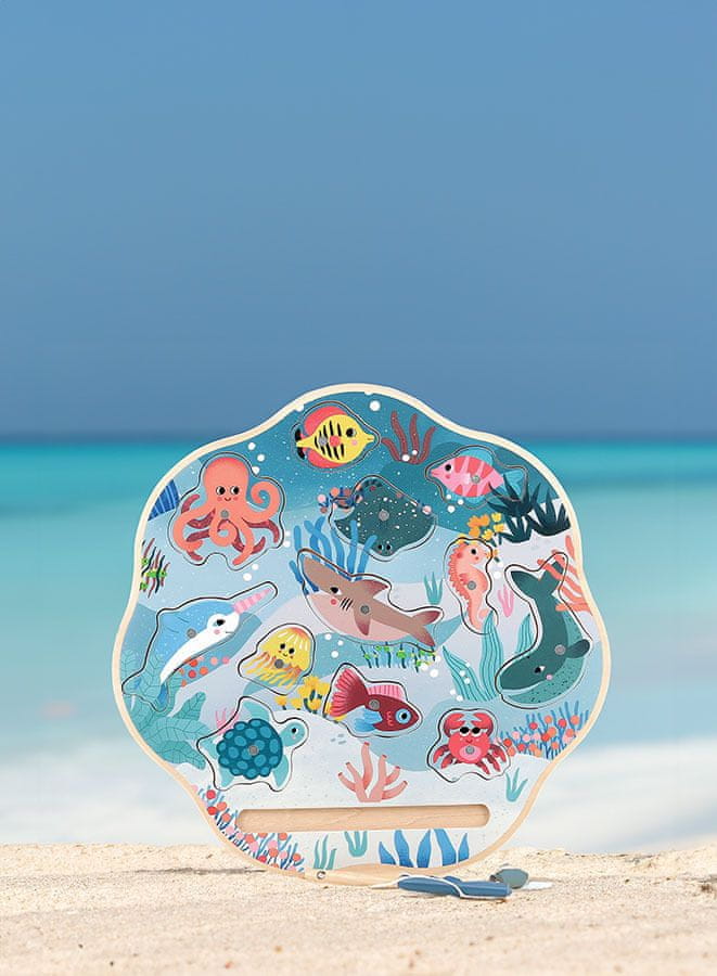 Magnetna igra, ki vas bo resnično navdušila! Ribe z morskimi živalmi v čudovitem dizajnu ilustratorke Michelle Carlsund. Ali lahko iz morja potegnete skata, kita, rakovico, želvo ali meduzo? Skupaj je 12 pisanih morskih živali. Ujemite jih vse! Vsaka žival ima na hrbtni strani številko, ki označuje točke. Ko ti uspe izvleči vse morske živali, jih obrni na glavo in preštej točke. Pri tej igri ni pomembno, koliko živali vam uspe izvleči s palico, ampak kdo ima več točk. Igra spodbuja kognitivni razvoj vašega otroka. Razvija koordinacijo rok in oči ter fino motoriko. Spodbuja tudi senzorično in izobraževalno učenje. Igra vsebuje: 12 lesenih morskih živali, 2 leseni palici z magnetom in 1 igralno podlago Glavne značilnosti: klasična igra v čudovitem dizajnupo zgledu igrač Montessorirazvija koncentracijo in potrpežljivostpomaga pri učenju štetja in pomnjenja sprimerna za otroke od 2. leta starostiigra lahko služi tudi kot sestavljankaPotujte z nami v naivni in elegantni svet danske ilustratorke Michelle Carlslund, svet nežnih barv, poln ljubkih medvedkov in prijaznih ptic. Leta 2010, ko je Michelle še študirala grafično oblikovanje, je svoje ilustracije tiskala doma in jih poskušala prodati na oblikovalskem trgu, kjer so naletele na velik uspeh! Več trgovin je želelo začeti prodajati njene stvaritve, zato je pomislila, da bi bilo zabavno ustanoviti podjetje. Michelle je hitro postala spoštovana neodvisna ilustratorka. Danes je njene okolju prijazne grafične umetnine mogoče kupiti po vsem svetu v oblikovalskih butikih, trgovinah s pisarniškimi potrebščinami in otroških trgovinah. Michelle navdihuje vse, kar jo obdaja. Njene stvaritve so nežne in poetične, stiliziran in otroški slog, ki se odlično ujema z igračami Vilac. „Sem ljubiteljica ocvrtega krompirčka, časovna optimistka, ekološka izdelovalka plakatov in samostojna ilustratorka iz Københavna na Danskem,“ bi rekla ilustratorka Michelle Carlslund, če bi se morala opisati v enem stavku.