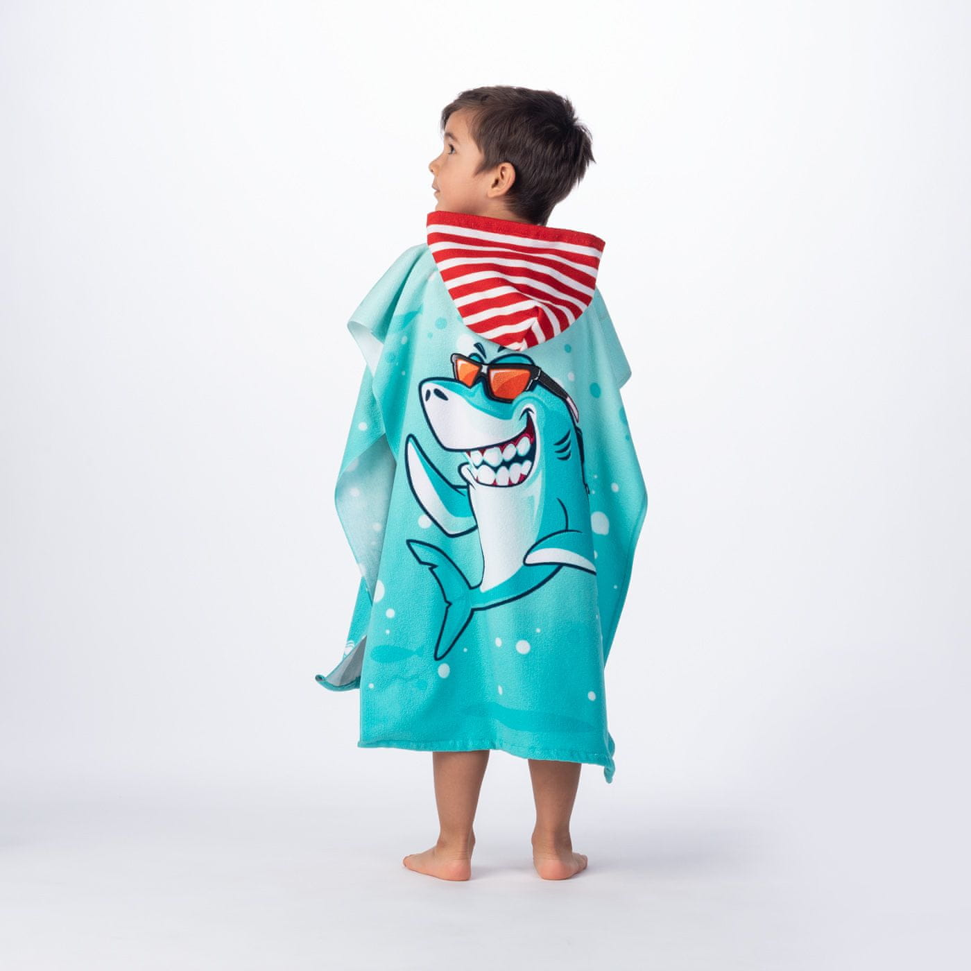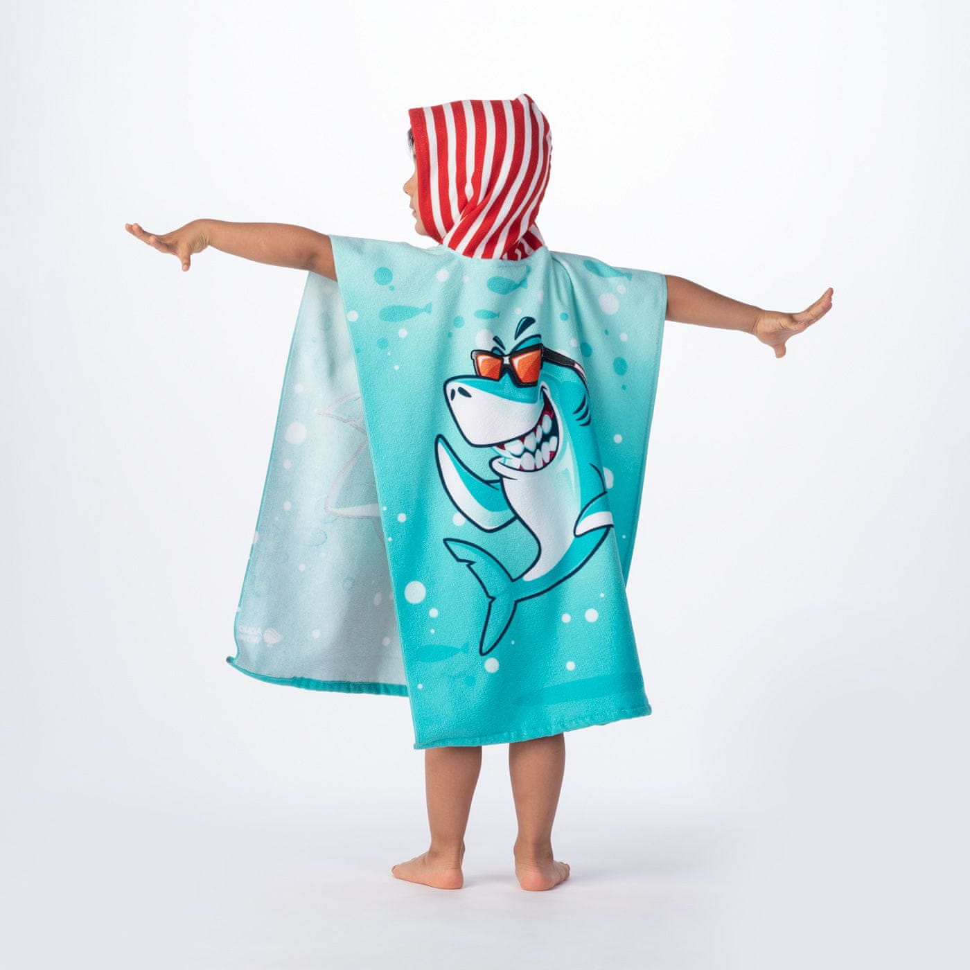 Otroški pončo SHARKI – hitro sušeča brisača s kapuco iz 100 % poliestra, idealna za poletne vodne dogodivščine. Celoten opis