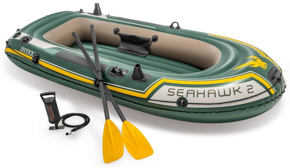 Napihljiv čoln za 2 osebi2 plastičnima vesloma in ročno črpalko. Intex Seahawk ima nosilnost 200 kg, napihljiva tla in ventil za hitro napihovanje. Izdelan iz kakovostnega PVC brez ftalatov. Po obsegu je nameščena zaščitna vrv in nekaj praktičnih nastavkov za različno opremo. Celoten opis