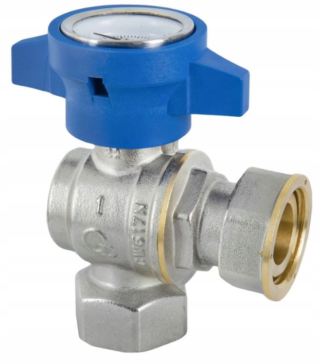 KOTNI VENTIL 1" Z ŽENSKIM POLVIJAČNIM NAVOJEM IN TERMOMETROM Z RAZPONO MODRE BARVE