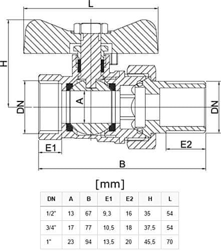 Kroglični ventil za vodo z navojem 1” GW/MZ, z metuljasto ročico Celoten opis