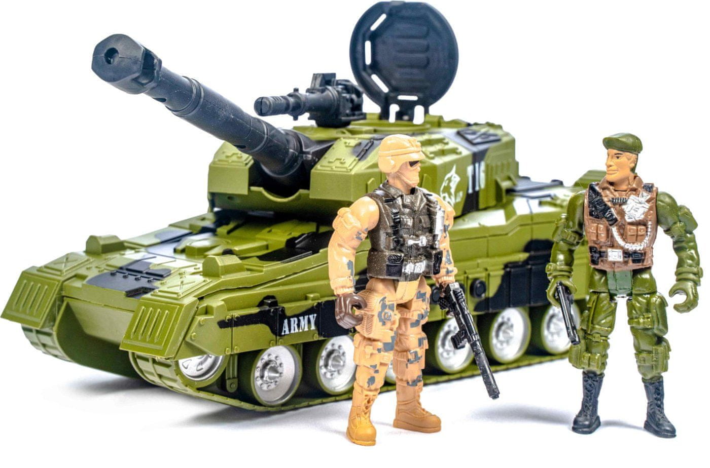 Paket vsebuje: tank z zvočnimi in svetlobnimi učinki, 2 figuri vojaka z gibljivimi sklepi, oviro, orožje in druge majhne dodatke za vojake