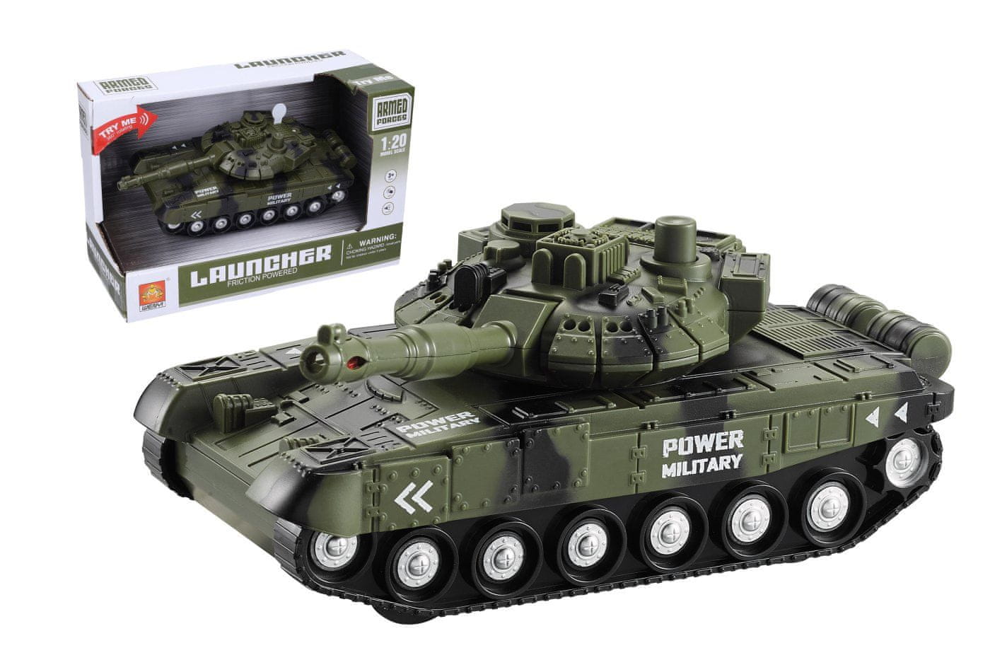 Tank z učinki. Velikost 19,5 × 8 × 7,5 cm. Svetlobni in zvočni učinki (zvok streljanja in motorja, utripanje topa). Aktiviranje s pritiskom na gumb na strehi. Na vztrajniku. Vključene so baterije 3×AG13. merilo 1:20