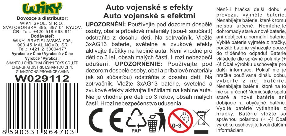 Vojaški avtomobil z raketo. Velikost 19 cm. Na vztrajniku. Svetlobni in zvočni učinki z gumbi v kabini avtomobila. Vključene so baterije 3×AG13.