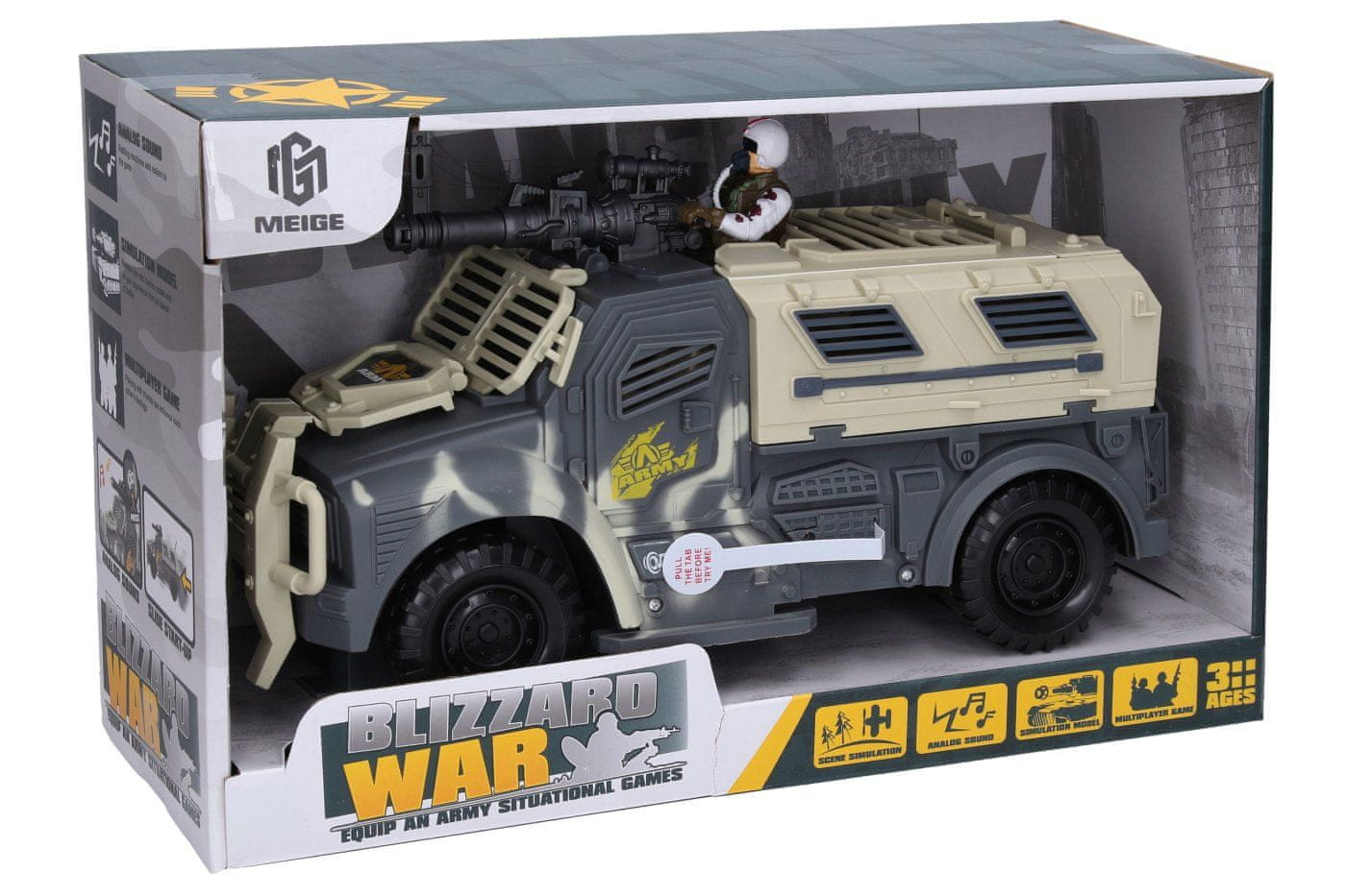Vojaški avtomobil z učinki. Velikost 31 cm. Celoten opis