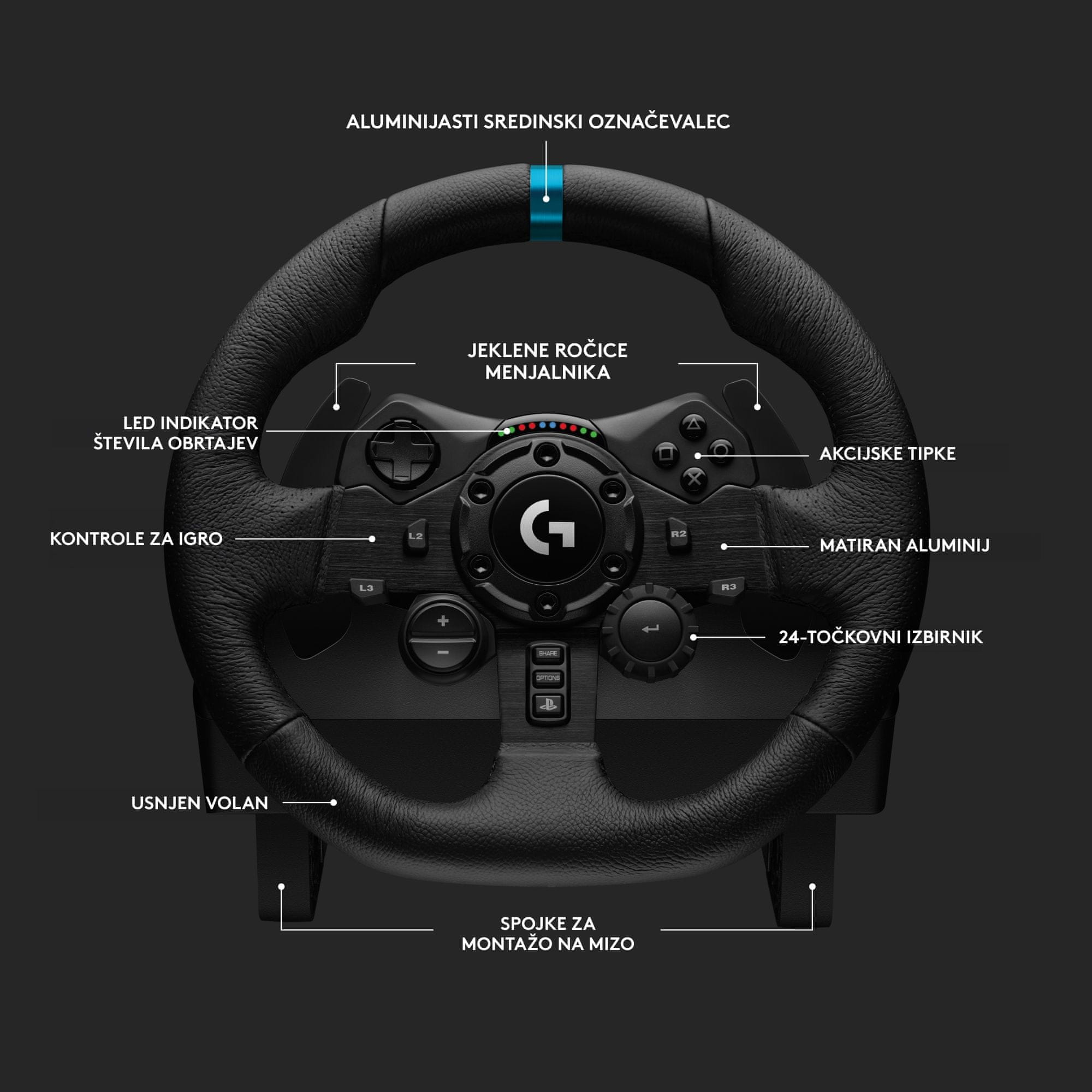 Klasična oblika z najnovejšimi elementi. Nove barve, kakovostna brušena kovina, kroj usnjenih delov v slogu avtomobilskih volanov in sijoči pedali sistemu G923 podelijo profesionalen videz. Dodelan dizajn spremlja izjemna funkcionalnost z vgrajenim prikazovalnikom na osrednjem delu volana in z dodatnimi vrtljivi gumbi.