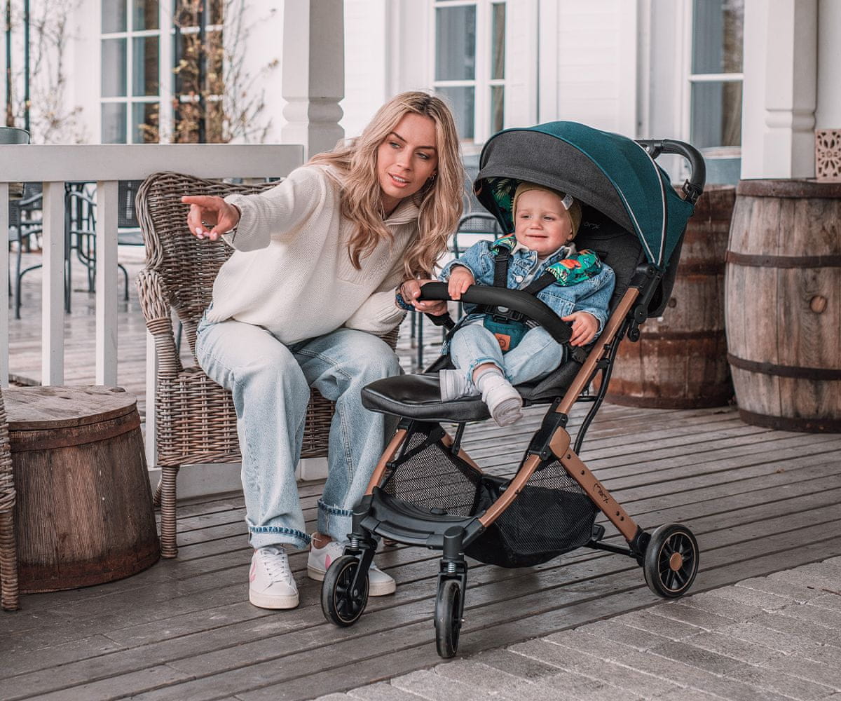Sodoben voziček ESTELLE podjetja MoMi z elegantnim zlatim okvirjem. Popolnoma varen in udoben voziček za vašega otroka. Eleganten in lahek za uporabo. Voziček je primeren za otroke od 6. meseca do 15 kg. Celoten opis