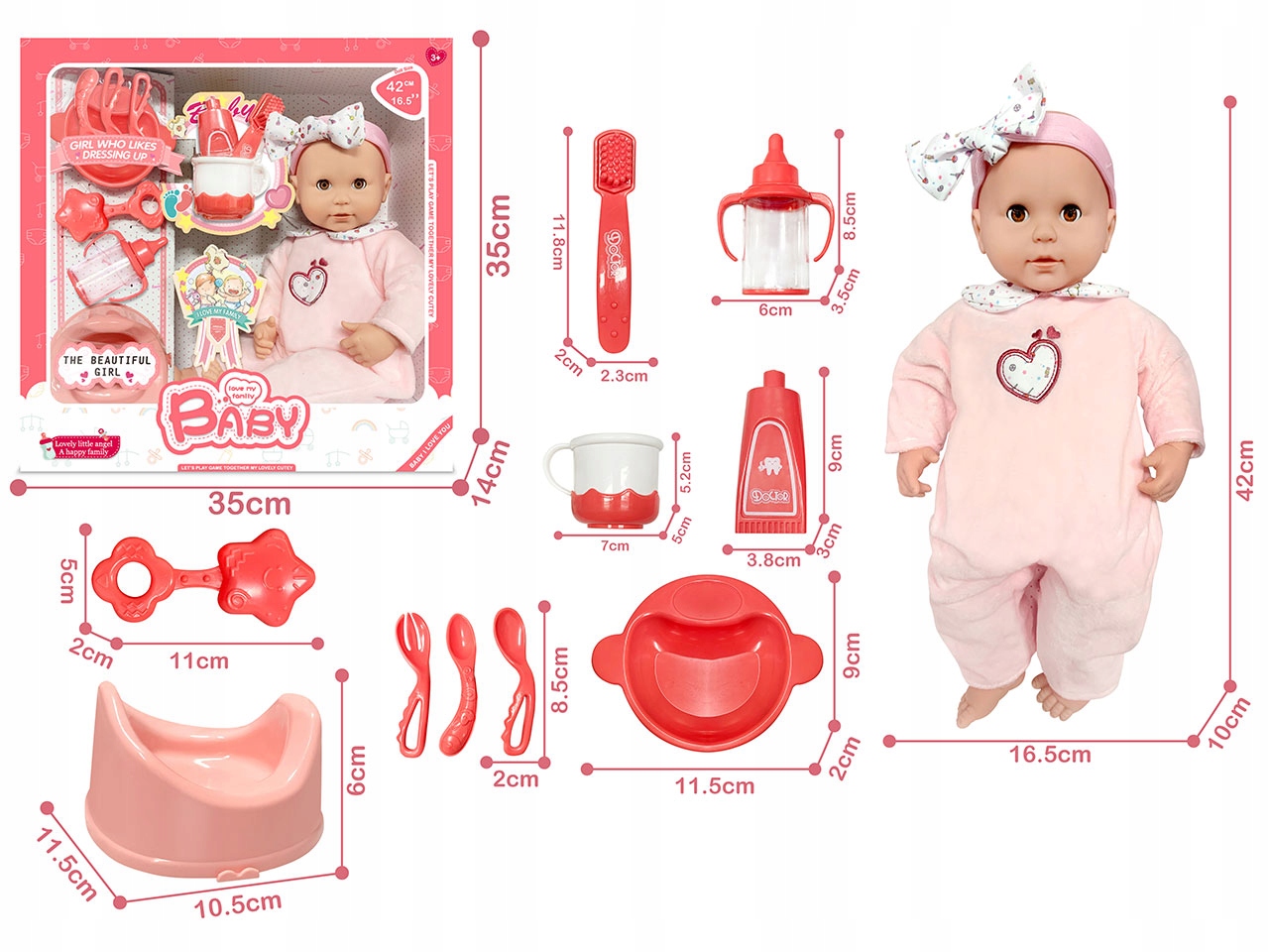 Čudovita punčka, izdelana z največjo skrbnostjo. Punčka ima prikupen obraz in ljubke oči, ki jih je mogoče zapreti. Glava, roke in noge so narejene iz mehke, visokokakovostne gume, pritrjene na mehko, polnjeno telo.