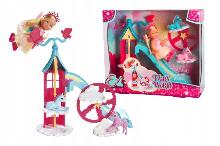 Doživite čarobne trenutke z igralnim kompletom Evi Love Fairy Playset. Evi Love in njena dva samoroga spremenijo vsako otroško sobo v čarobni kraj. S svojimi pisanimi vilinskimi krili in čudovito, bleščečo pastelno obleko je Evi Love čarobno videti kot vila. Skupaj s svojimi malimi samorogi lahko Evi Love doživi čarobne trenutke kot vila na priloženem igralnem stolpu. Tobogan, dvigalo na ročico in predvsem čarobno panoramsko kolo v obliki oblaka, ki lahko sprejme oba samoroga, zagotavljajo čarobno zabavo.