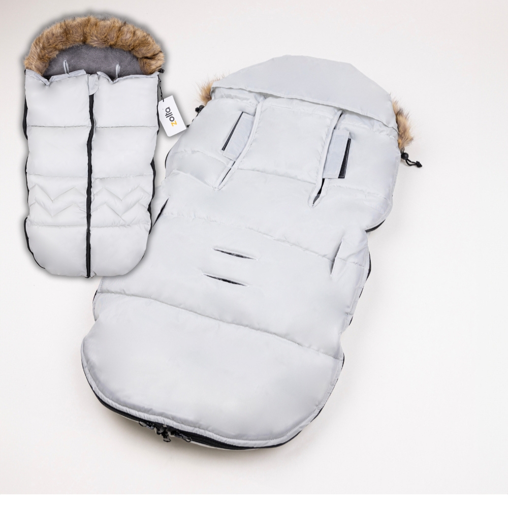 Vrečka za noge ima luknje za varnostne pasove , ki omogočajo varen prevoz vašega malčka z 2-, 3– in 5-točkovnimi pasovi.