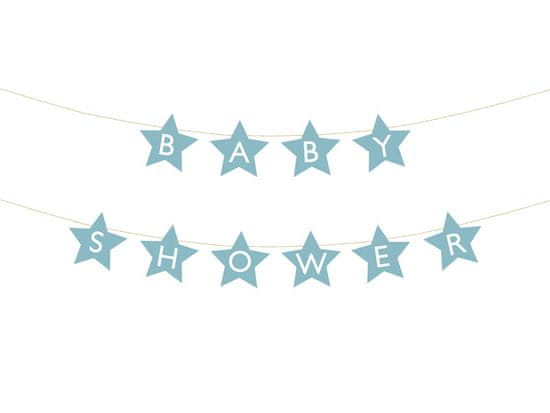 Zvezdast transparent z napisom Baby Shower, izdelan iz svetlo modrega papirja, dimenzije vrvice približno 3 m.