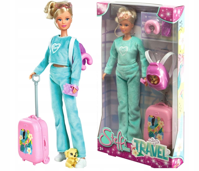 s tropskim vzorcem, ki ga Steffi lahko vleče za zložljiv ročaj. Poleg tega ima punčka roza nahrbtnik-nosilec