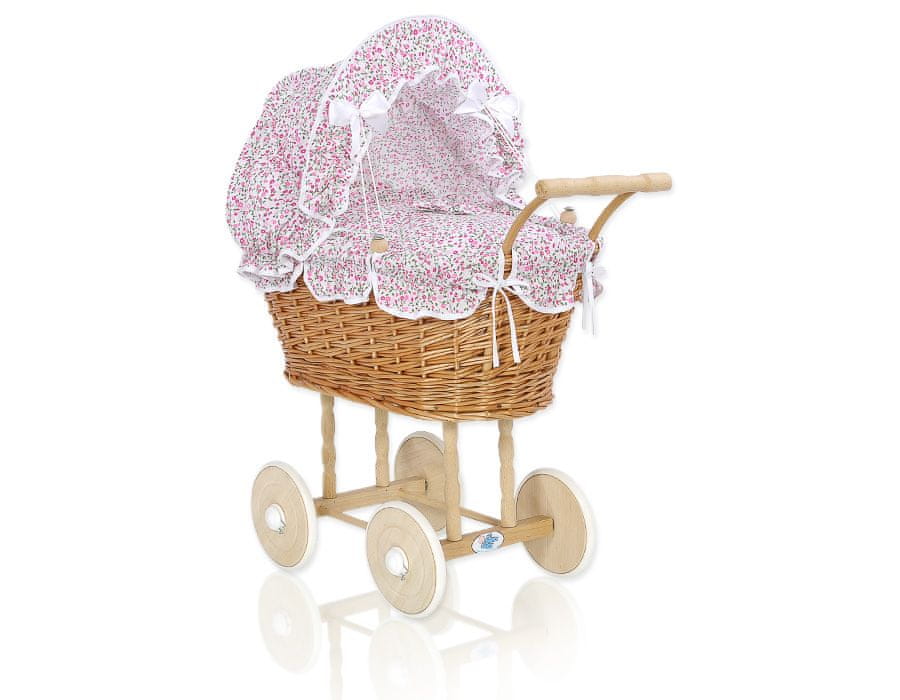 Visok pleten voziček za punčke z roza posteljnino in podlogo – naravno Celoten opis