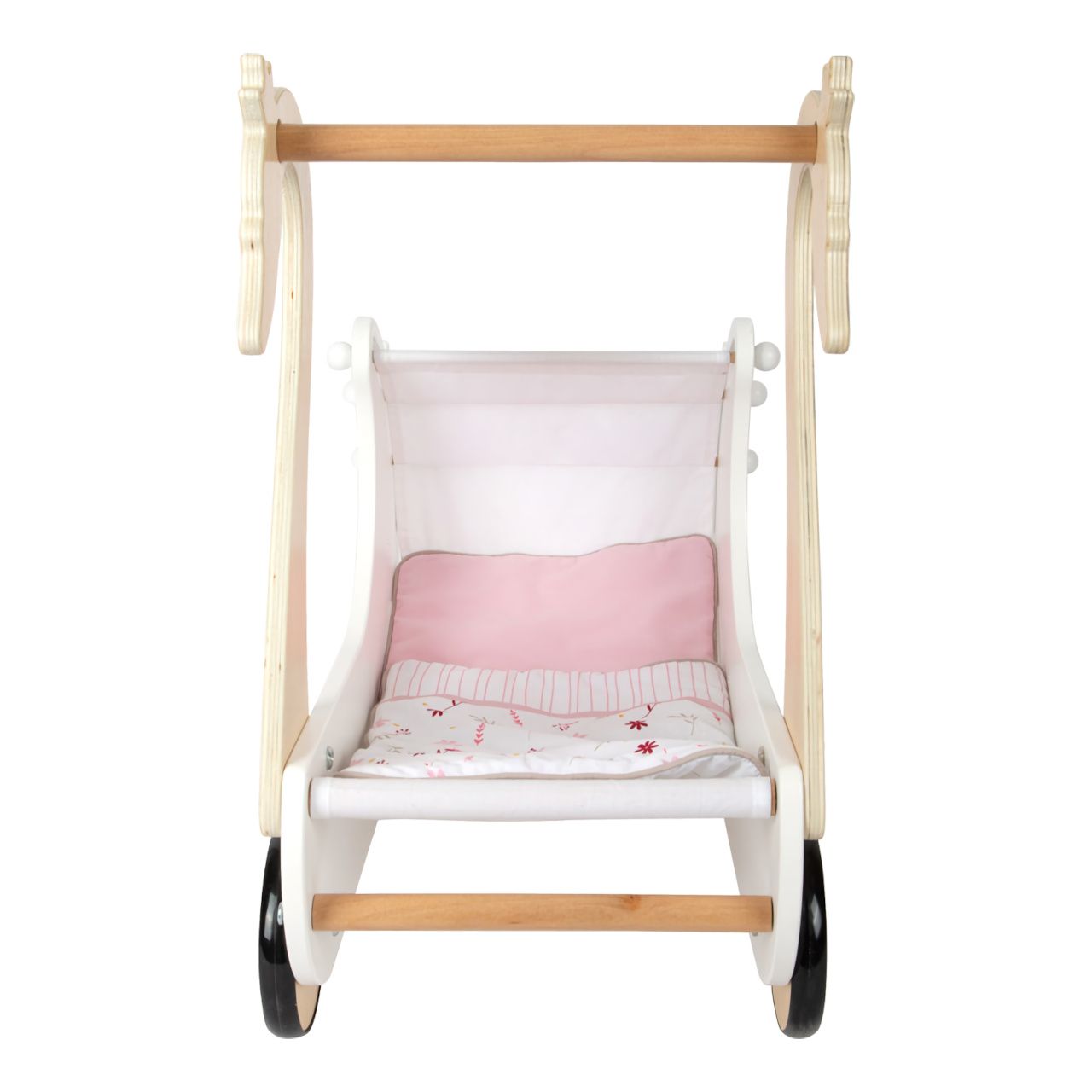 Skrbite za svoje lutke z labodjo eleganco! Naj otroci razvijajo svojo domišljijo in socialne veščine. Voziček bo s svojimi prefinjenimi barvami in preprostimi oblikami igrivo dopolnil vsako dekliško sobo. Vanj lahko namestite prevelike lutke, ima zložljivo platneno streho in je opremljen s cvetlično roza in belo posteljnino. Gumirana kolesca zagotavljajo prefinjeno tiho vožnjo po vseh vrstah površin in jih varčujejo. Konstrukcija združuje trpežno vezano ploščo in na otip posebej prijeten masivni les. Izdelek je treba sestaviti, priložena so mu podrobna navodila za sestavljanje. Glavne značilnosti: voziček s posteljninoza lutke do višine 46 cmsnemljiva strešicamajhen odtis stopaltrajna lesena zasnova