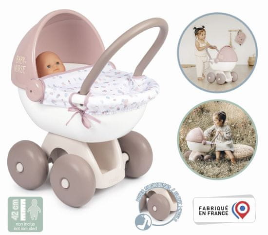 Voziček za globoke lutke iz linije Baby Nurse, zasnovan posebej za najmlajše. Narejen je iz visokokakovostne plastike, ki jo je enostavno čistiti. Prevleka iz tkanine je snemljiva in jo je mogoče prati. Izjemno stabilna konstrukcija, ki je zaradi štirih koles zelo enostavna za upravljanje. Primeren za vse lutke do 42 cm. Lutka ni vključena. Dimenzije izdelka (DxŠxV): 36,5 × 53,5 × 47,5 cm.