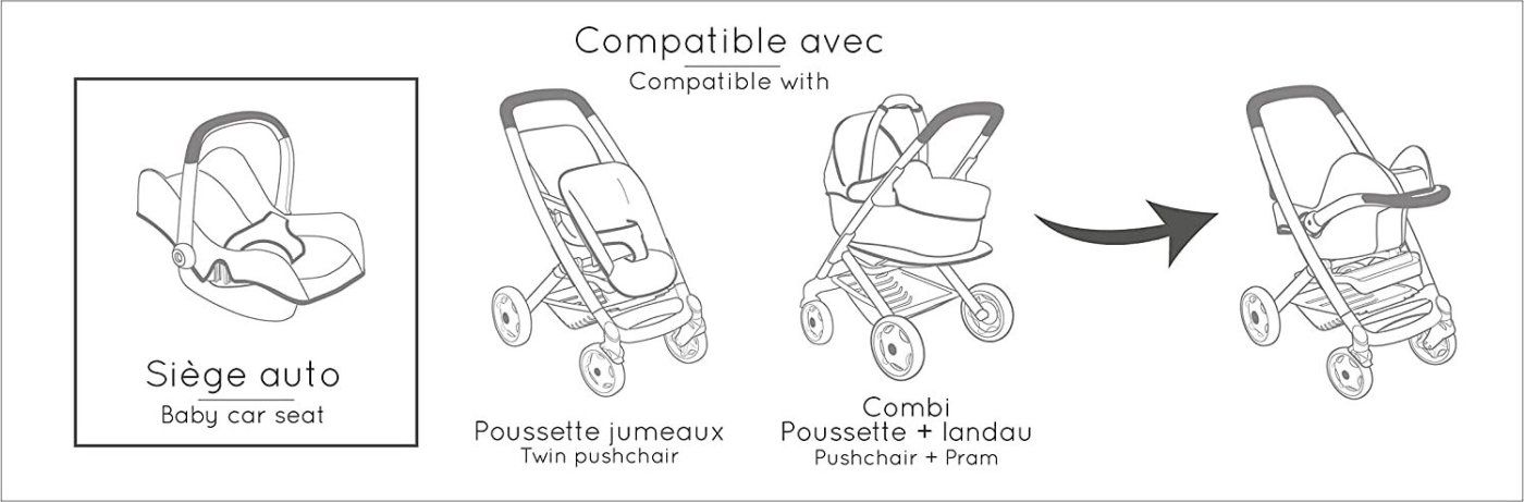 Kombinirani voziček za lutke do velikosti 42 cm. Z odstranljivo košarico. S pritrditvijo zibelke dobite globok voziček ali pa se voziček lahko uporablja samo kot športni voziček. Prenosni voziček se lahko uporablja tudi ločeno. Kolesa s protihrupno prevleko, premera 15,5 cm in 12,5 cm. Sprednja kolesa so vrtljiva. Trpežne plastične prevleke iz blaga lahko očistite z vlažno krpo. Za notranjo in zunanjo uporabo.