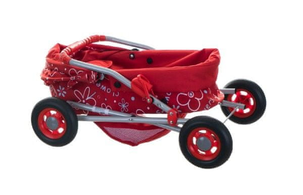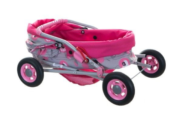 Ta voziček je kot nalašč za majhne deklice , zasnova je preprosta in stabilna, zato je voziček lep in ima estetski videz. Poleg tega so opremljeni s košarico in nakupovalno vrečko, v katero lahko male mamice skrijejo potrebne pripomočke za lutke. Njegove prednosti so tiha plastična kolesa s penastim ohišjem. Teža: 2,5 kg Dimenzije: višina 55 cm, širina 35 cm, dolžina 60 cm.Height ročaji 50 cm. 50 cm.Primerno za otroke od 3. leta starosti.