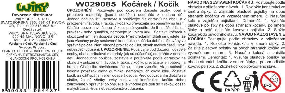 Globok zložljiv voziček za lutko. Dimenzije 43×34×65 cm. Kovinska konstrukcija. Priložena so papirnata navodila za sestavljanje vozička in njegovo zlaganje za prevoz. Primeren za lutke velikosti 43 cm.
