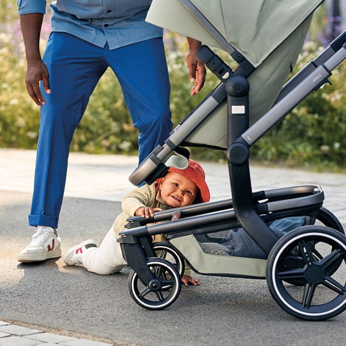 Ročaj vozička je nastavljiv po višini. Inovativna oblika lahkih koles pa omogoča izjemno gladko in brezskrbno vožnjo po različnih terenih. Vrtljivo prednje varovalo s funkcijo obračanja za 360° lahko enostavno odprete z eno roko, kar vam omogoča enostaven dostop do otroka, hkrati pa poskrbi za njegovo varnost med vožnjo.