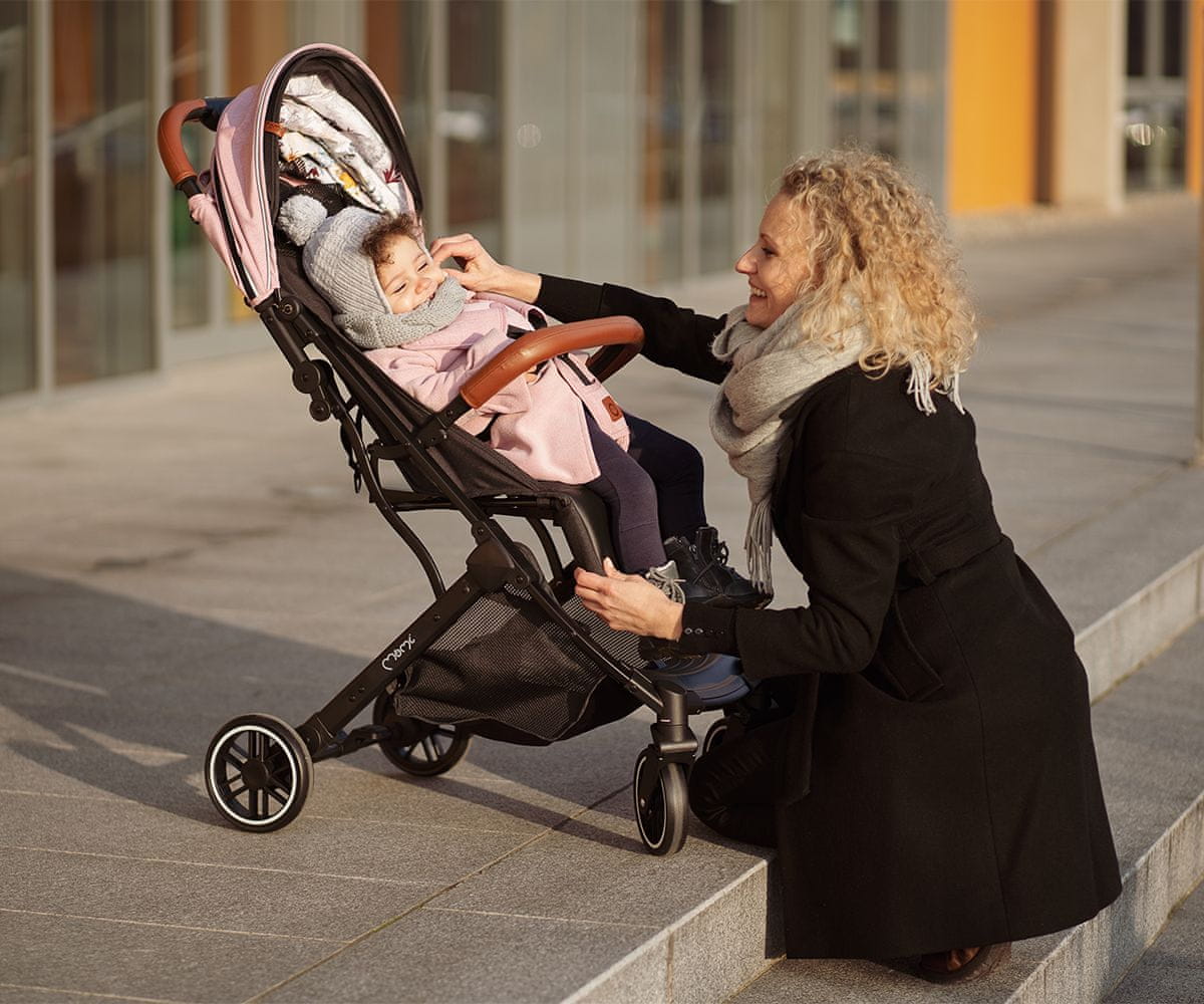 - Ročaj za potiskanje – ko je voziček zložen, ga lahko potiskate s priročnim ročajem.