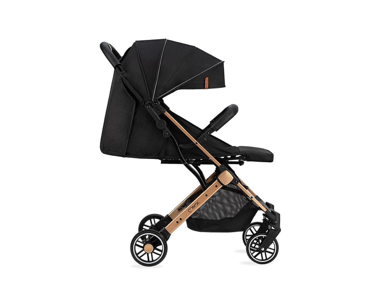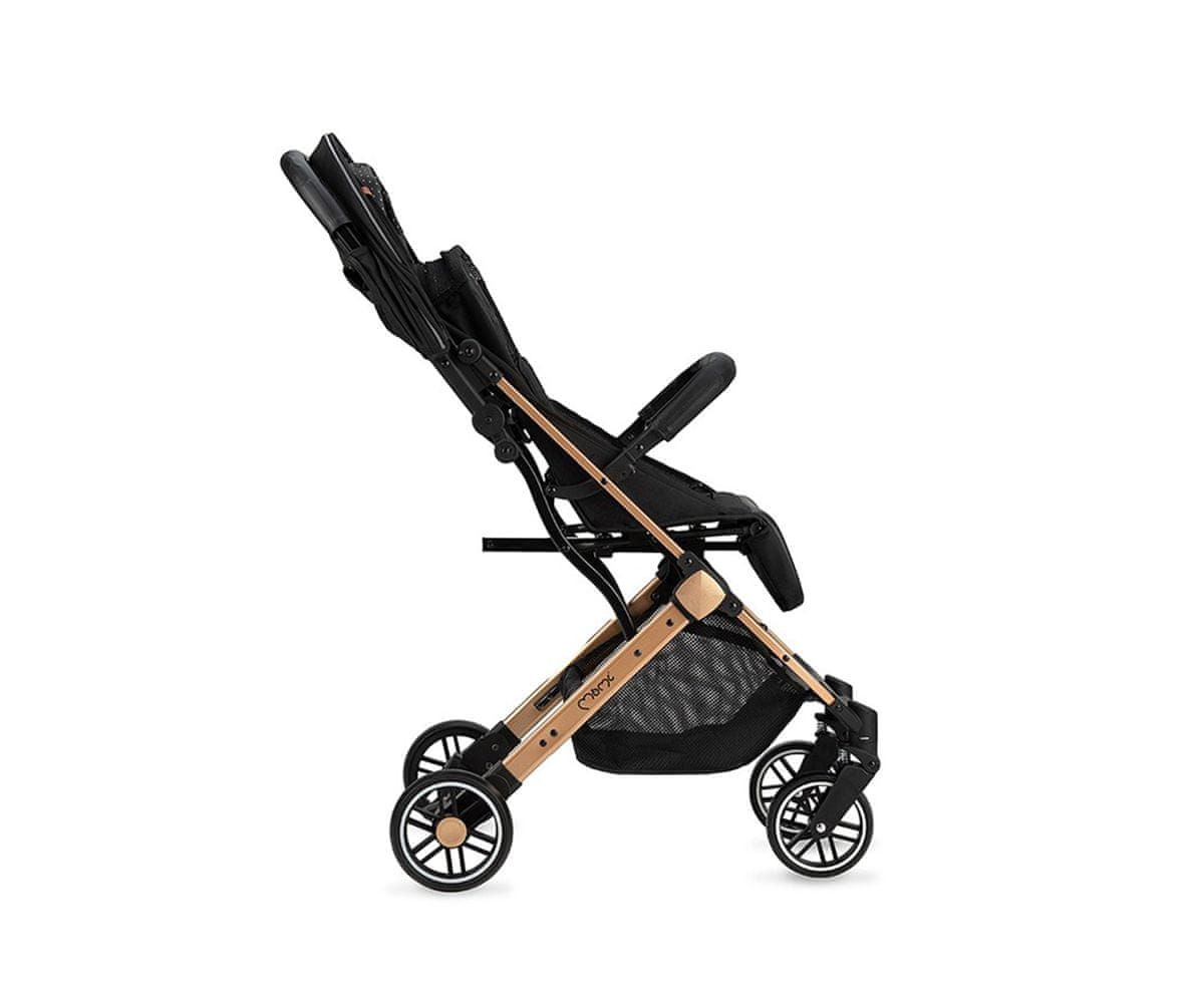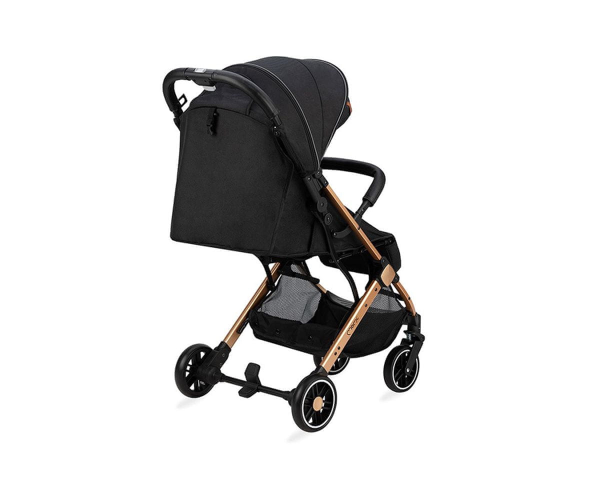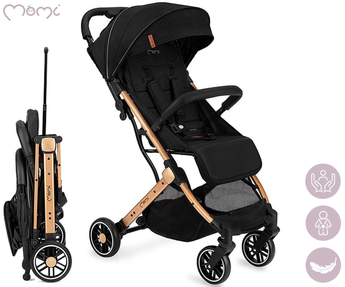 MoMi ESTELLE Gold 2v1 otroški voziček, zložljiv, streha, naslonjalo, pasovi, črno-zlat