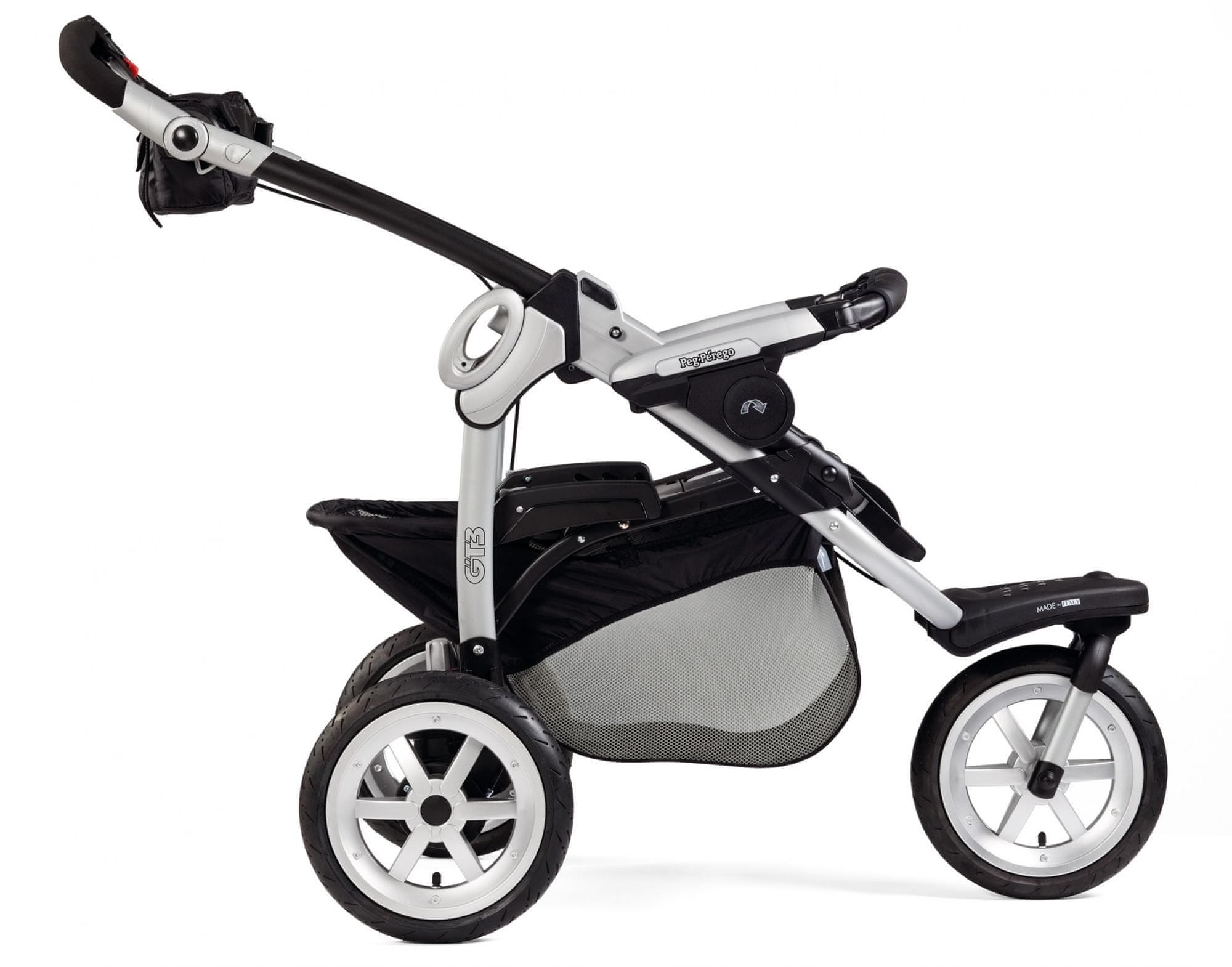 GT3 je trikolesni voziček, s katerim boste vi in vaš malček lahko uživali na vseh terenih v vseh razmerah, saj ima velika, napihljiva, širokoprofilna kolesa, ki so enostavno odstranljiva in vrtljivo prednjo kolo. Ima lakirano aluminijasto ogrodje, streho, ki ima vdelano mrežo za boljše zračenje in nastavljivo hrbtno naslonjalo. Prednje varovalo je nastavljivo in odstranljivo. Ročaj je nastavljiv po višini.