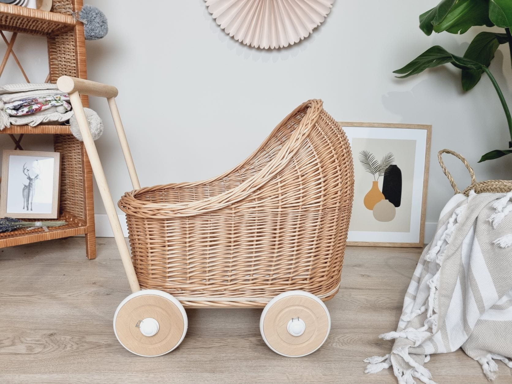 Pleten voziček za punčke s potiskalom, naravni les Celoten opis