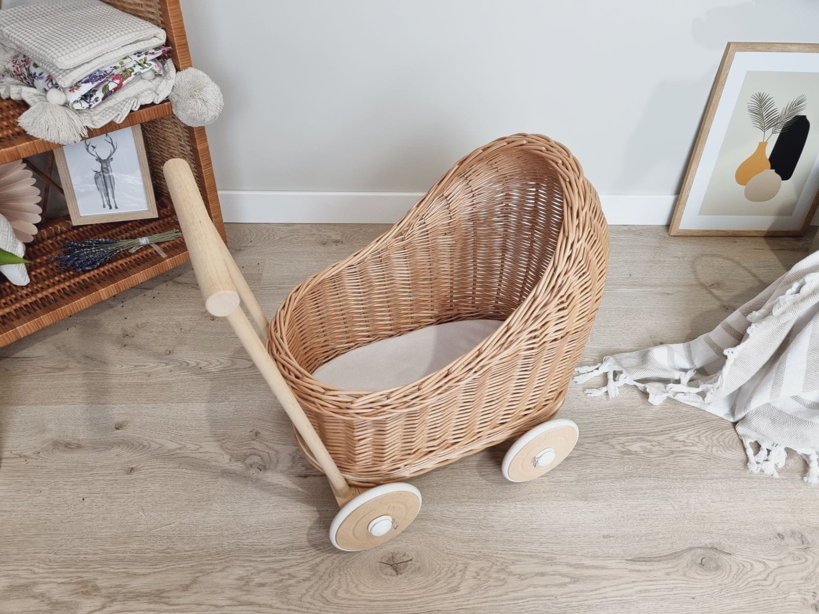 Ponujamo protjast voziček za punčke z naravnim lesenim podvozjem.