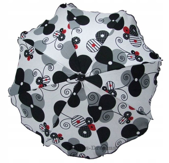Ta dežnik je izdelan iz najkakovostnejše tkanine, odporne na spreminjajoče se vremenske razmere. Nepogrešljiv dodatek za vsak voziček in otroški voziček. Zahvaljujoč kovinski cevi, opremljeni z vzdržljivo vzmetjo, lahko ta dežnik nadomesti dežno prevleko in učinkovito zaščiti vašega otroka pred dežjem in še posebej pred škodljivim UV-sevanjem. Trdno izdelan je okrogle oblike. Vsi ostri konci so skrbno prekriti, da se preprečijo nenamerne poškodbe vašega malčka.